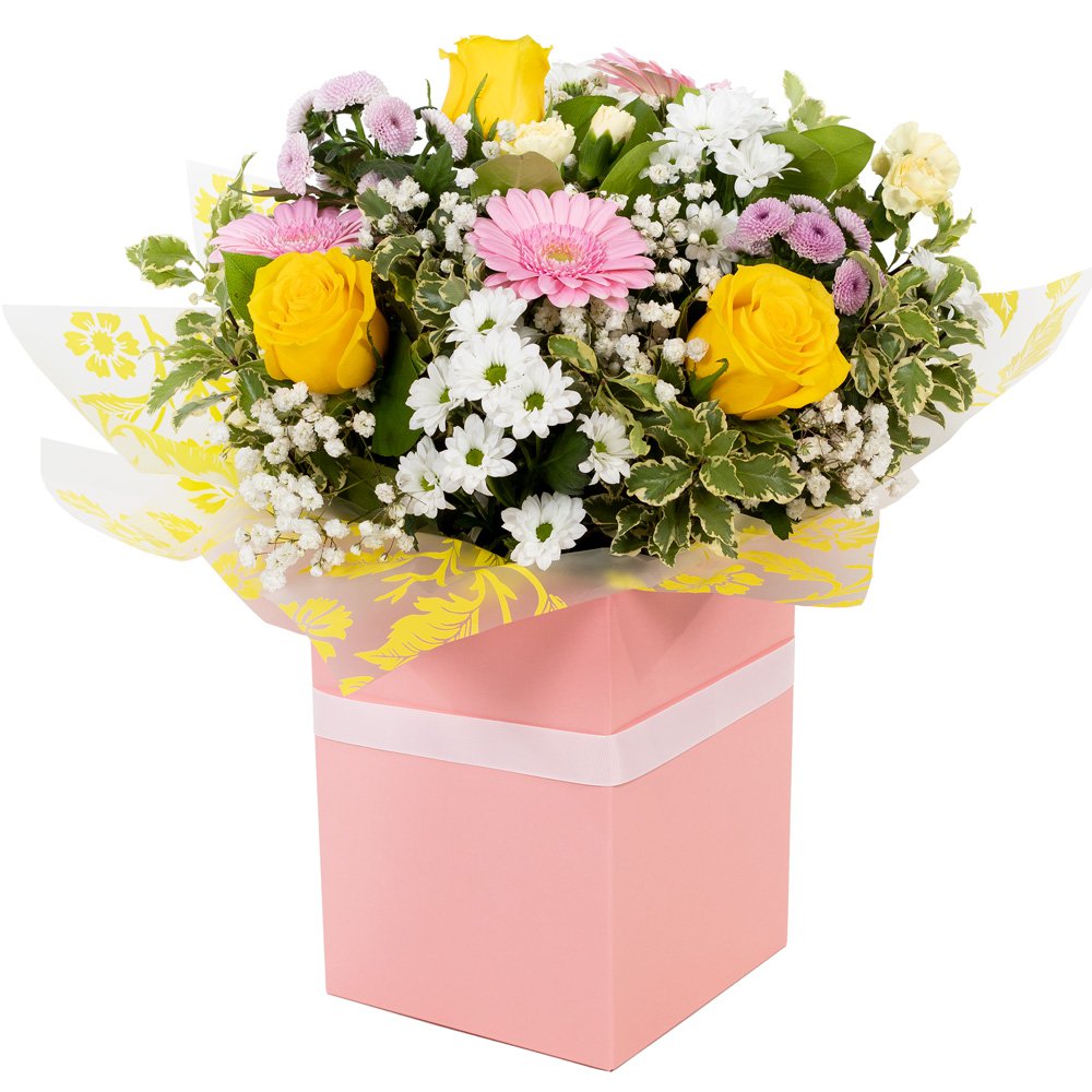 Flowers to put a smile on her face on Mother’s Day. Let her know you’re thinking of her with this beautiful ensemble of florist fresh flowers, perfect for the occasion.
